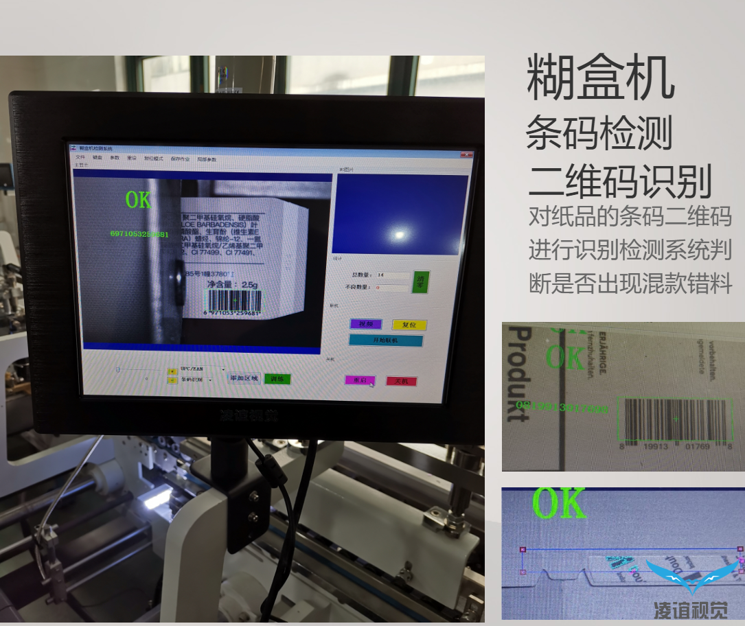 糊盒機防混料檢測系統(tǒng)是加裝在糊盒機走紙行道上,采用先進的視覺影像識別算法和架構(gòu),可對圖案、文字、條碼、字符等多種特征進行學習建模。軟件通過算法進行高速識別匹配輸出控制信號。采用CCD工業(yè)相機采集圖像,比老舊的色標傳感器、智能讀碼器兼容范圍廣,識別能力強,不僅可以高速讀取上百種類型的條碼。還可以文字比對、鐳射圖案、色塊顏色識別等方式實現(xiàn)防混料。當發(fā)現(xiàn)混料時,可自動停機供人工排查復位或?qū)⑿盘杺鬏斀o剔除機構(gòu)(需要機臺具備自動剔除功能)實現(xiàn)自動剔除。